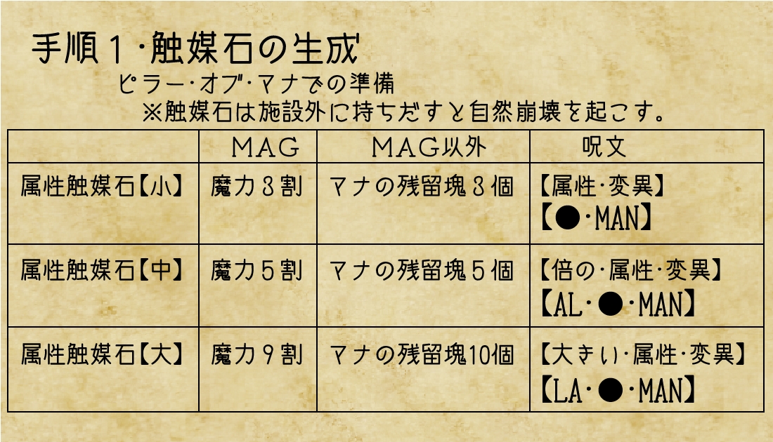 魔法器具は先ほどのピラー・オブ・マナで触媒石を作って、アルター・オブ・マナで生成します。